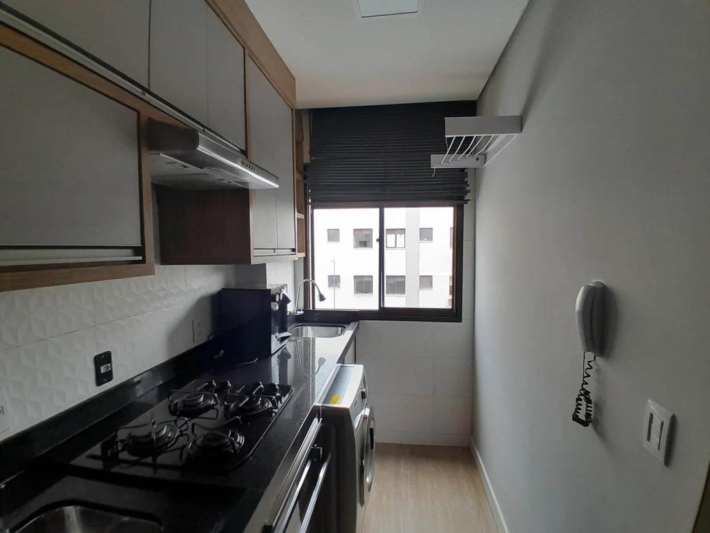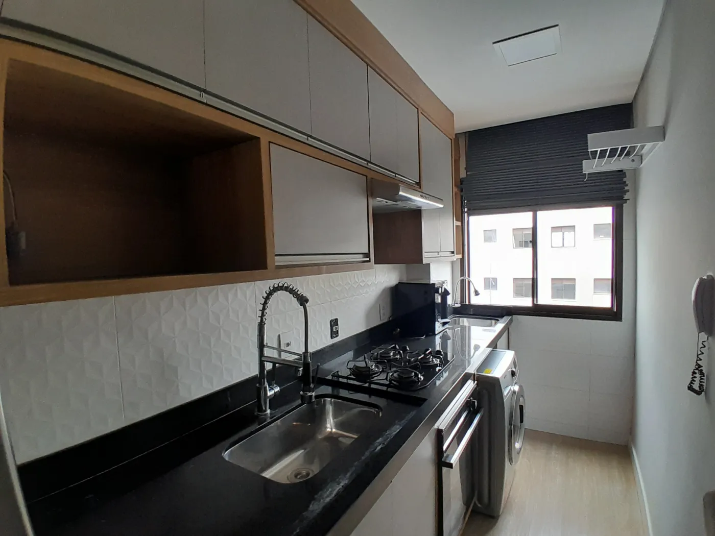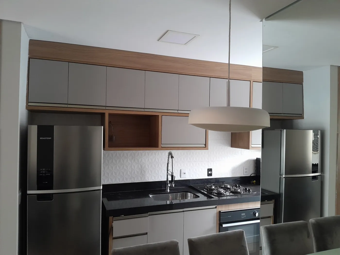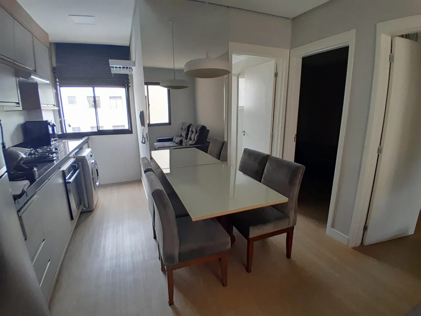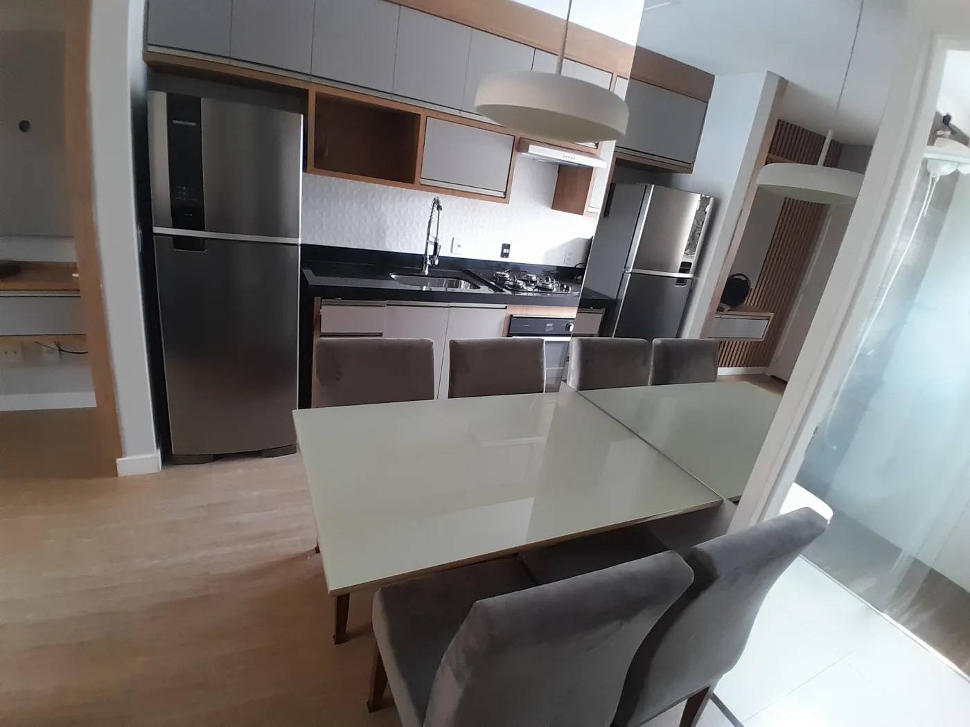 Área Interna: 02 Dormitórios com Armários Planejados sendo 01 com Ar Condicionado, Sala com Painel e Sofá, Cozinha com Armários Planejados (Mesa com Cadeiras, Geladeira, Sugar, Forno Elétrico, Cooktop, Filtro de Água), Área de Serviço com Armários e Máquina de Lavar, Banheiro Social com Armário e Box, Laje, Sanca, Piso Madeira, Piso Frio e Revestimento.